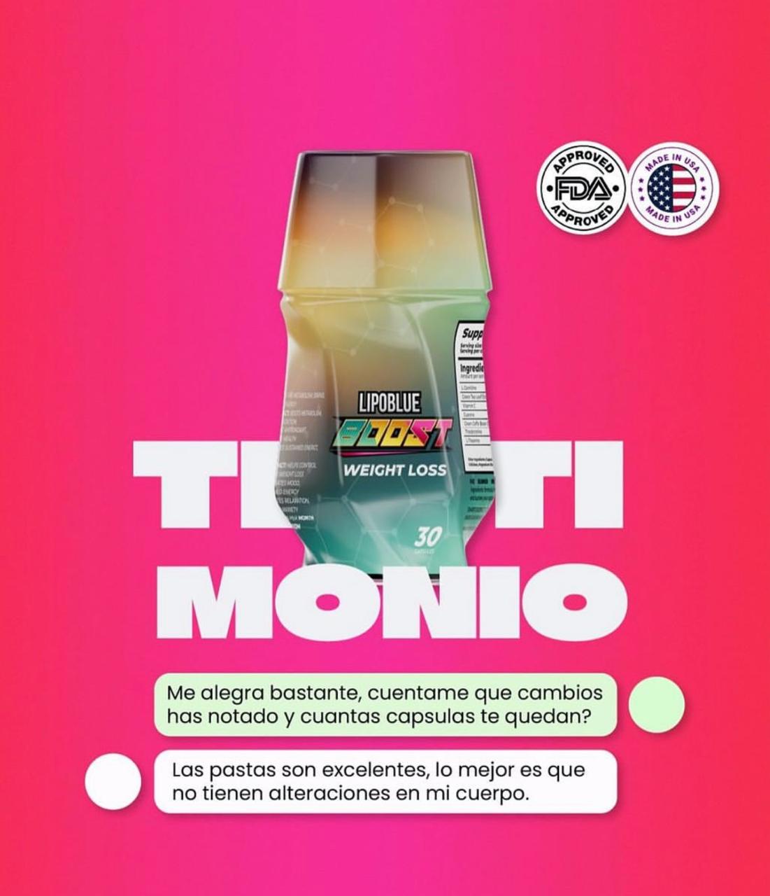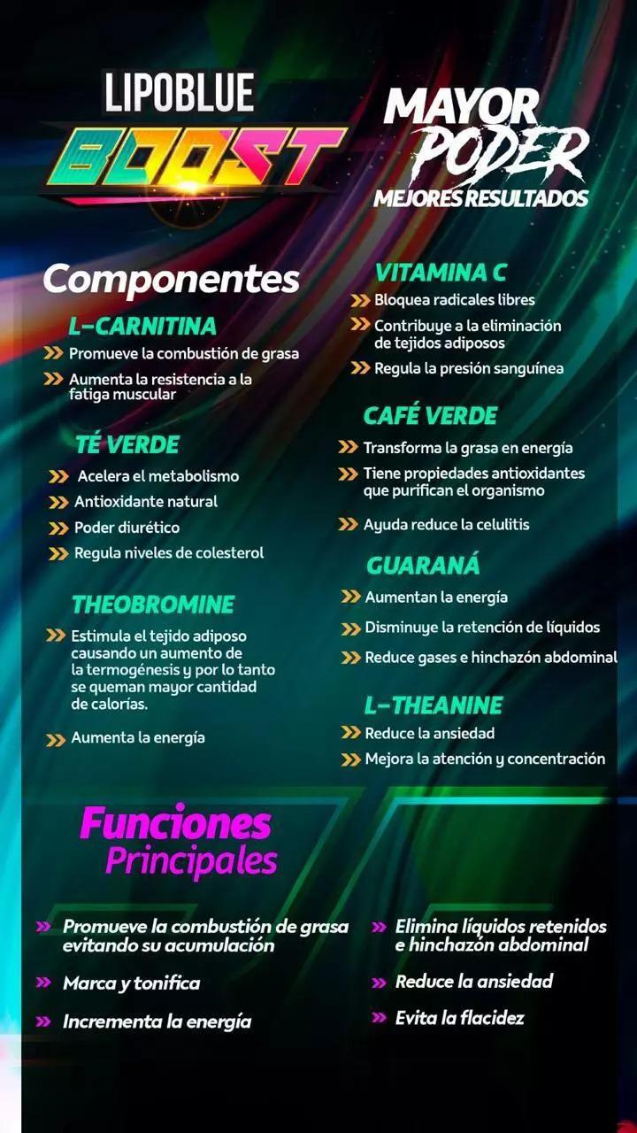 LipoBlue Boost es un quemador de grasa avanzado diseñado para quienes buscan resultados rápidos, más energía y una reducción visible de medidas. Su fórmula moderna combina estimulantes termogénicos y extractos naturales que aceleran el metabolismo, controlan el apetito y ayudan a eliminar grasa localizada. Ideal para complementar rutinas de ejercicio y planes alimenticios. 💪🔥